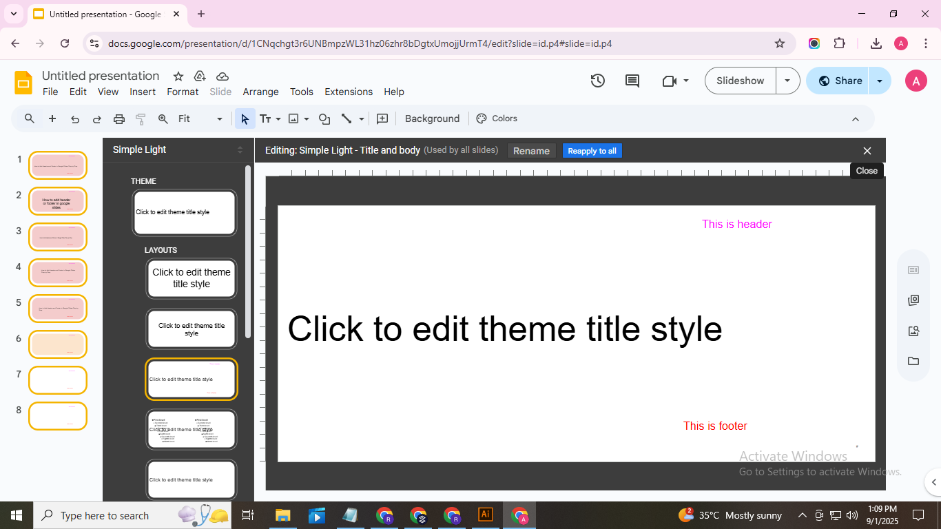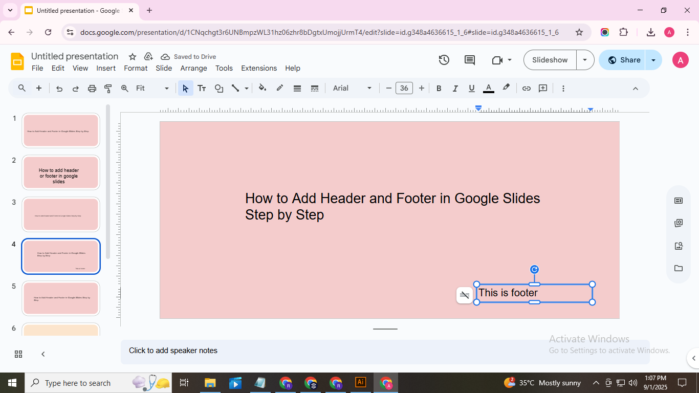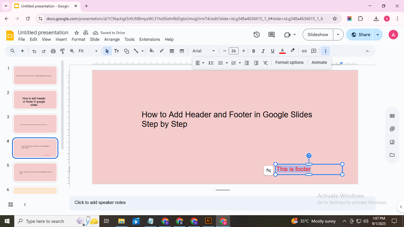 Step 7: Review your slides to make sure the header and footer appear correctly. Adjust text if needed.