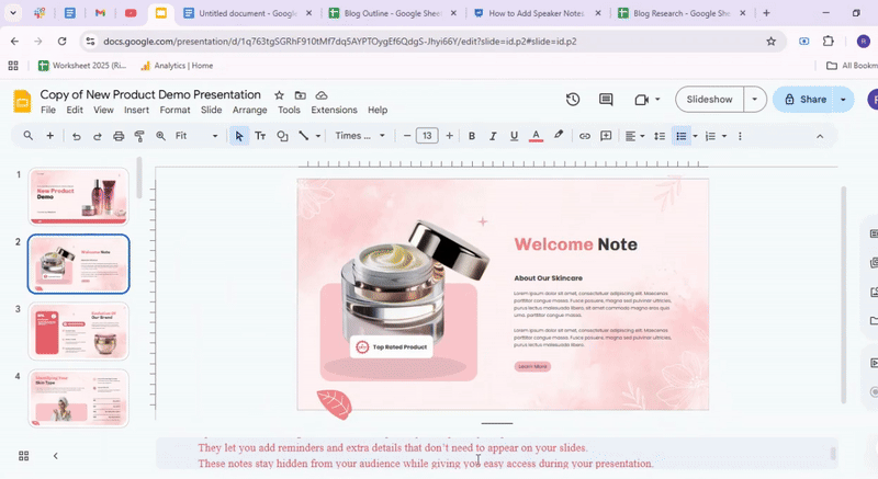 Adding speaker notes in Google Slides helps you stay organized while presenting. These notes are visible to you during your presentation but hidden from your audience. Follow these steps to add and manage speaker notes effectively.