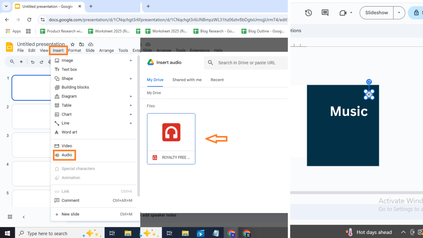 Insert: Open your Google Slides presentation. Pick the slide where you want the audio. Click Insert, then Audio, and select your uploaded file from Drive.
