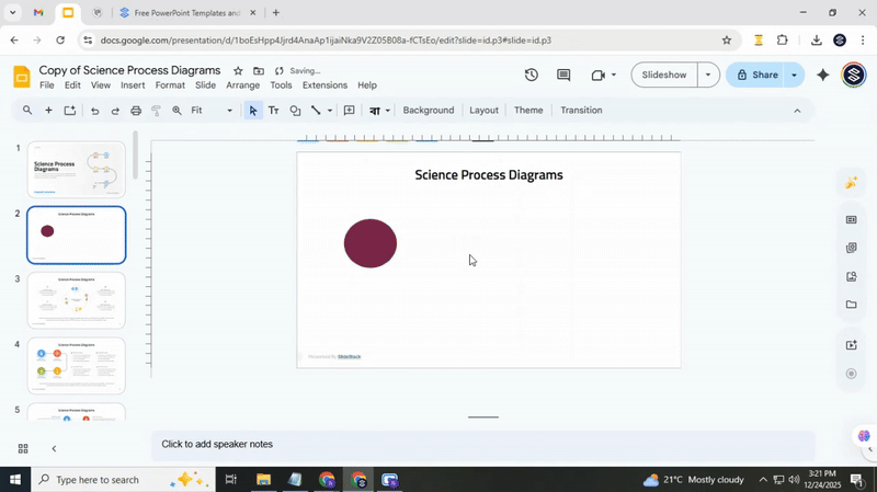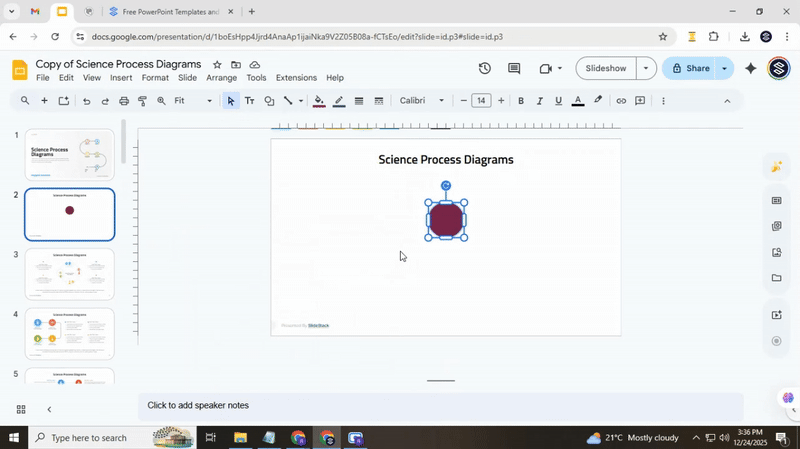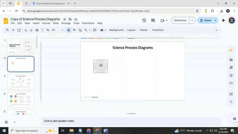 Click and drag the circle to center it on the slide. Make sure there is enough space around it for any connected ideas you will add later. Resize the circle if needed by dragging the corners while holding Shift.