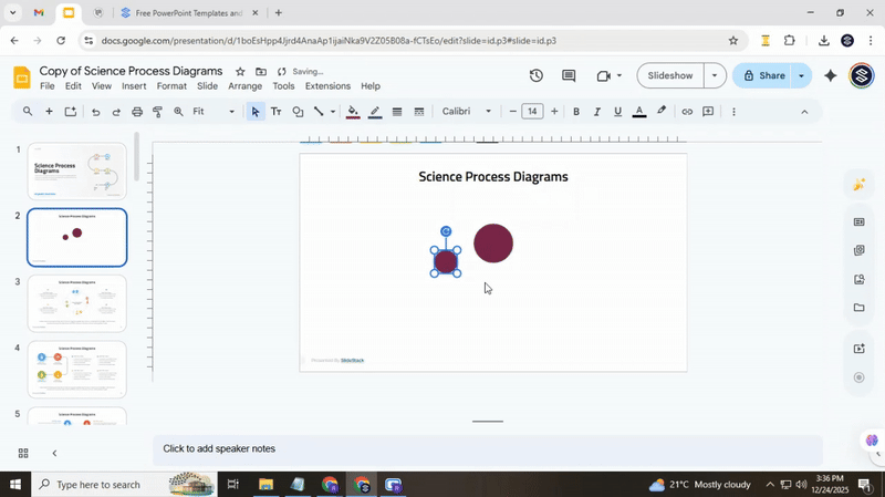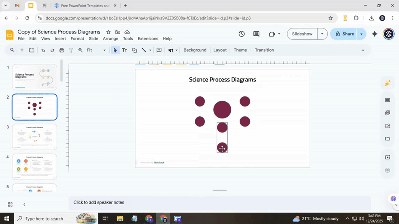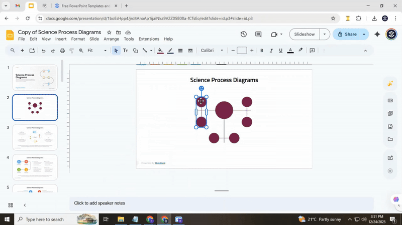Place the next node slightly above the main circle. Use the visual guides (deep magenda lines) in Google Slides to make sure your nodes are aligned. Position the new nodes as needed. For balance, place them on the opposite side of the main circle. Copy and paste them again to create the last pair of nodes.