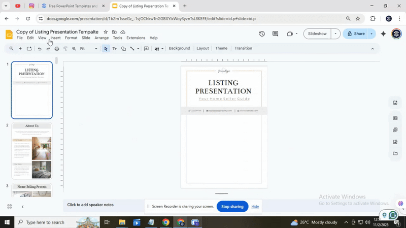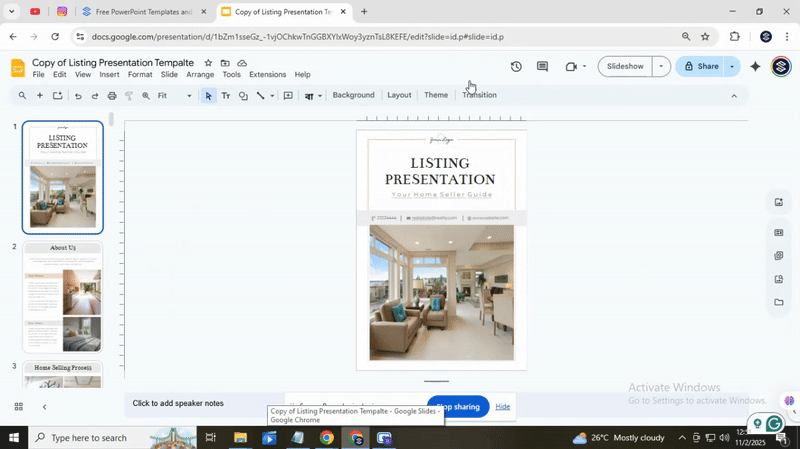 After you finish editing your flyer, it is time to save it for printing or sharing. Start by removing any slides you don’t need. Click on the slide you want to keep and move it to the beginning. Then, select all other slides and press the Delete key. This leaves only your final design ready for export.