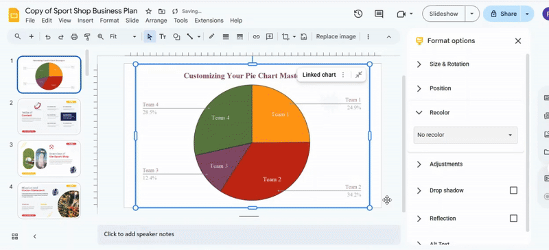 After opening the spreadsheet, you will see a list of charts it contains. Click the pie chart you want to import. You can select the option to Link to spreadsheet so that any future updates in Google Sheets will automatically appear in your slide. Then click Import to add the chart to your presentation. Once the chart is on your slide, click and drag it to position it correctly. Use the corner handles to resize the chart without distorting its proportions. Make sure the chart labels are easy to read and that the colors are clear for viewers.