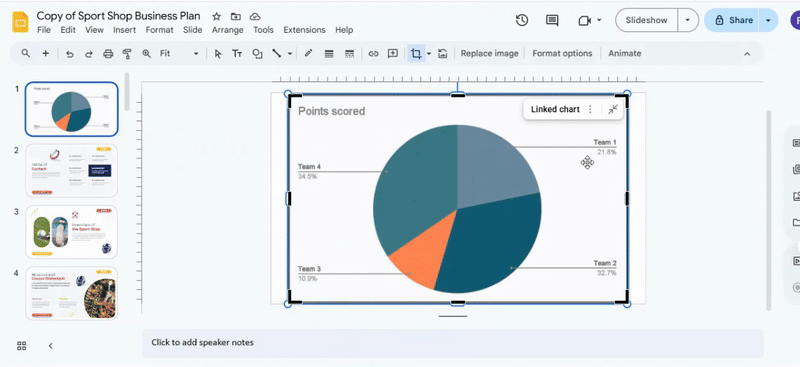 Yes. Go back to Google Slides and select your chart. Click Animate, then choose how you want the chart to appear on the slide. You can control the speed and style of the animation.