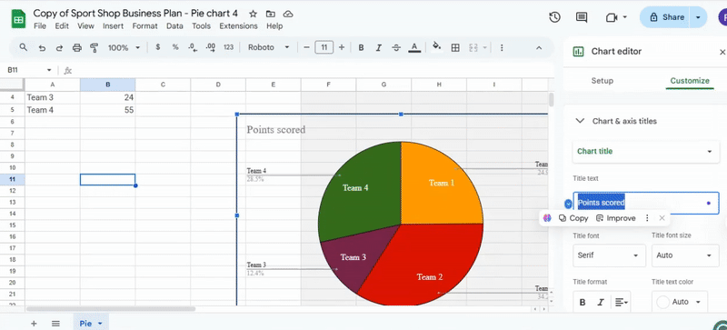 Click the chart title at the top. Type a clear title that describes your data, then press Enter. You can also edit axis titles in the Chart Editor under the Customize tab.