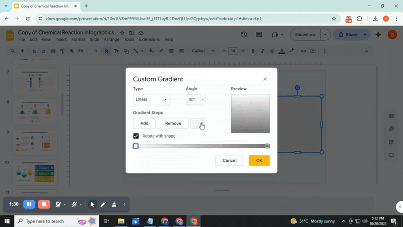Next, we customize the shape. Click on it, then choose the Fill color tool from the toolbar. Open the gradient tab and pick one of the preset gradients. For more control, click Customize to create your own. Set the start and end colors, adjusting them to match your design.