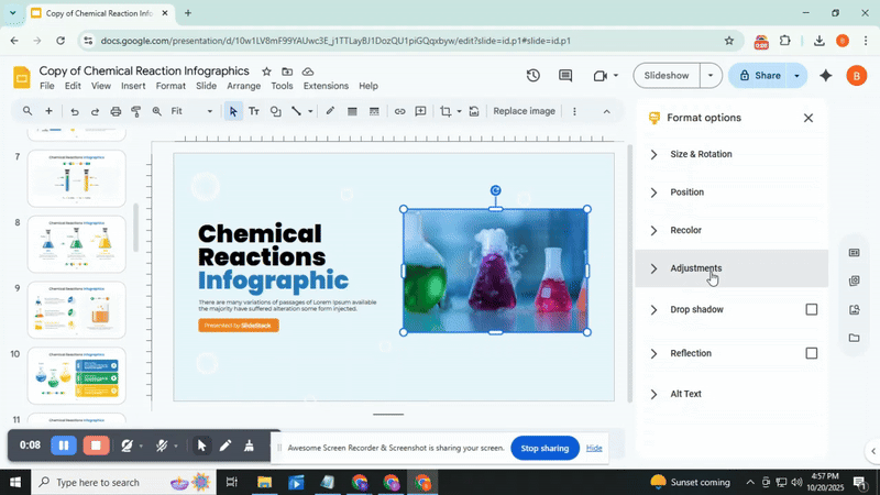 Now we make the gradient more natural. Click Format options, open Adjustments, and move the Transparency slider. You’ll notice how one color fades into the image. Keep adjusting until it blends nicely. Try changing the gradient direction or colors for different moods.