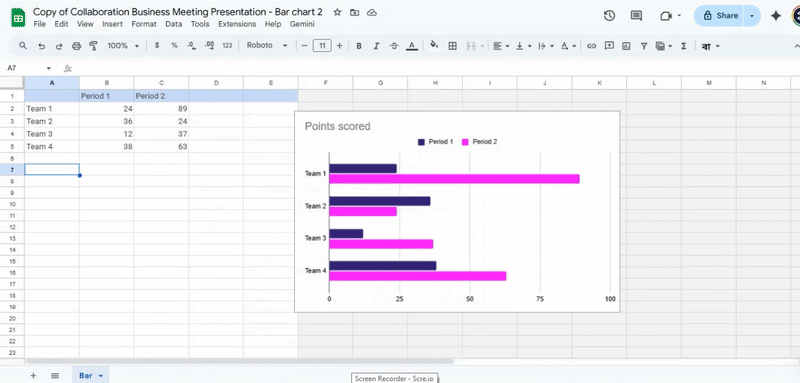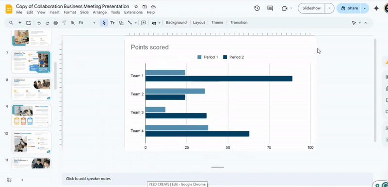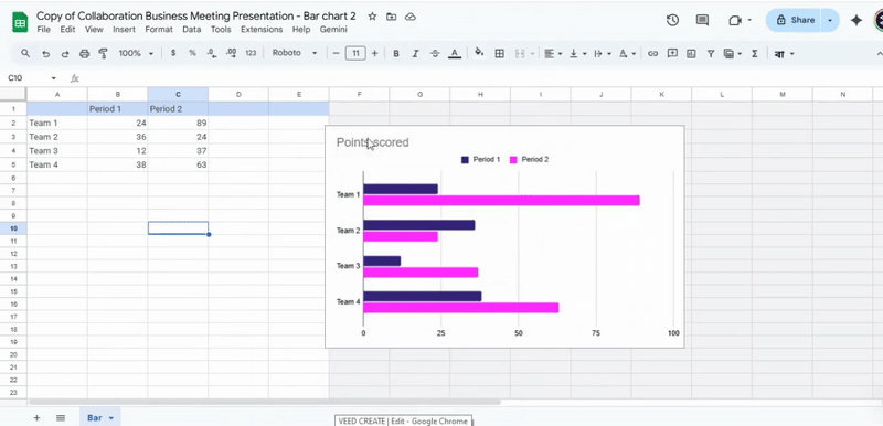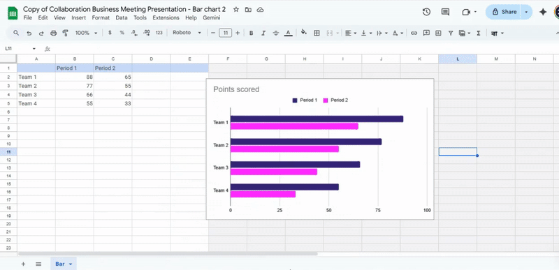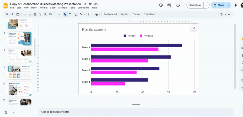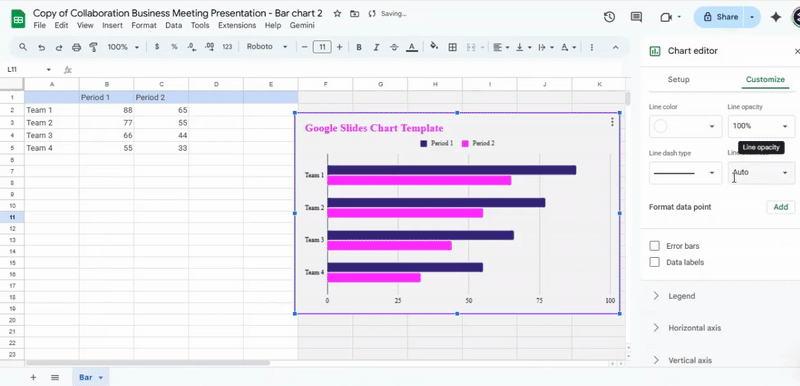Click “Insert” > “Chart” > “Bar.” Edit the data through the linked Google Sheets sheet. You can change labels and colors to match your slide.