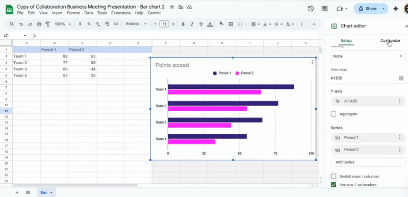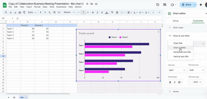 The Chart editor panel is your main tool for advanced customization. It has two main tabs: Setup and Customize. In the Setup tab, check the chart type. Switch between bar, line, or other chart types depending on the data you want to show. The Customize tab has several sections for more detailed editing. In Chart & axis titles, enter or modify the chart title, axis titles, and labels. This ensures the chart communicates the data clearly.