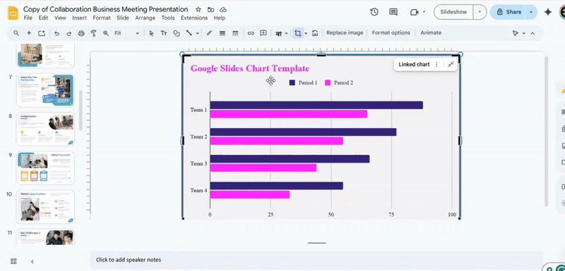Alternatively, you can copy a chart from Sheets. Go to the chart in Sheets, right-click, and select Copy chart. In Slides, right-click and choose Paste. You can choose to link it to the original spreadsheet or keep it as a static image.