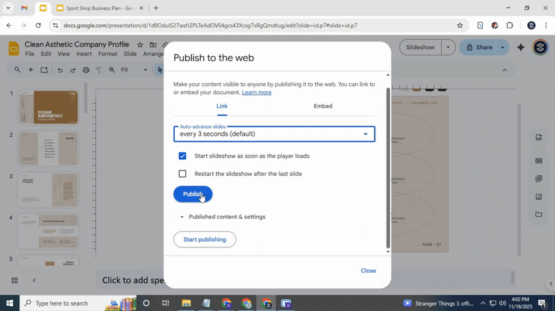 Making your slides play automatically is simple with the “Publish to Web” option. This method lets your presentation start on its own and move through slides at the pace you choose. Follow these steps to set it up.