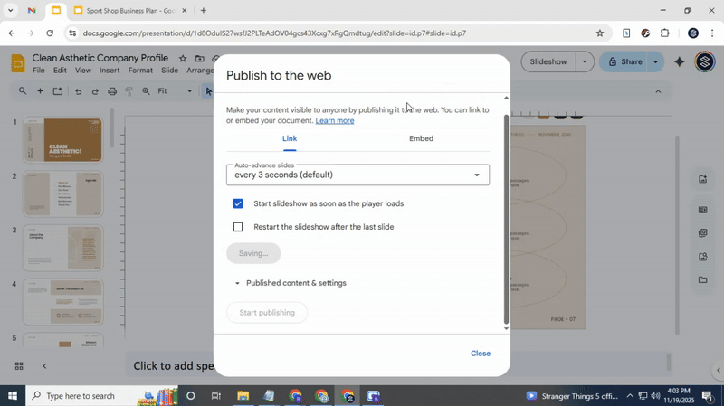 In the pop-up window, select the Link tab. Turn on Start slideshow as soon as the player loads. This ensures your presentation begins automatically for anyone opening the link.