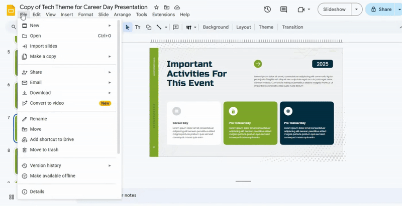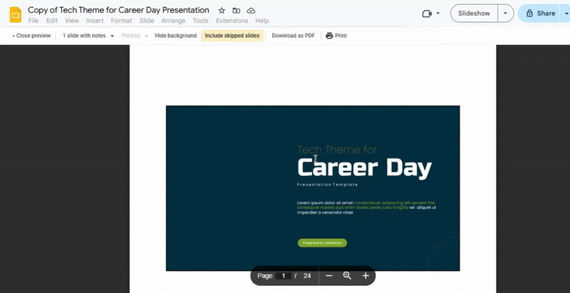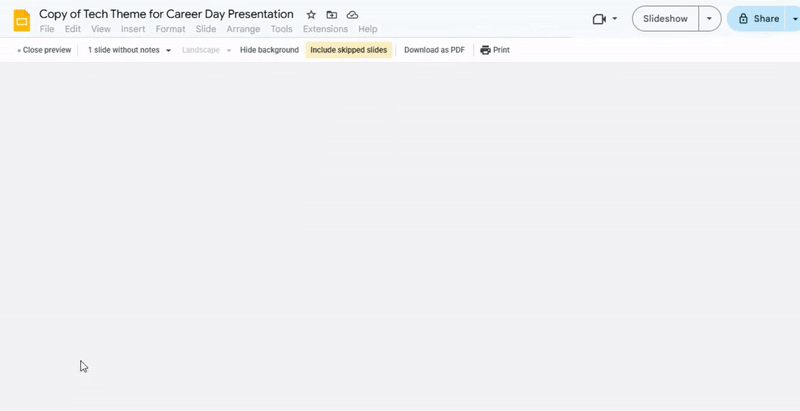 From the File menu, find and select “Print preview.” This will show how your slides will appear when printed.
