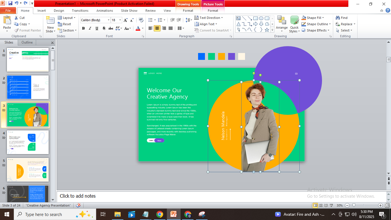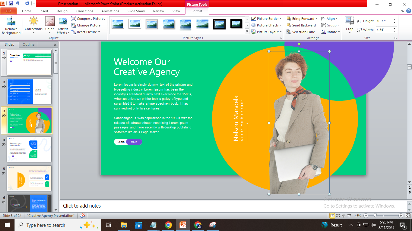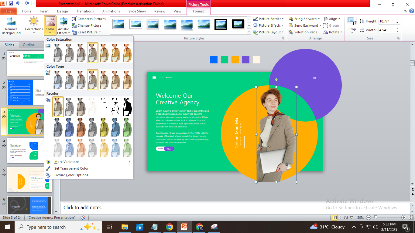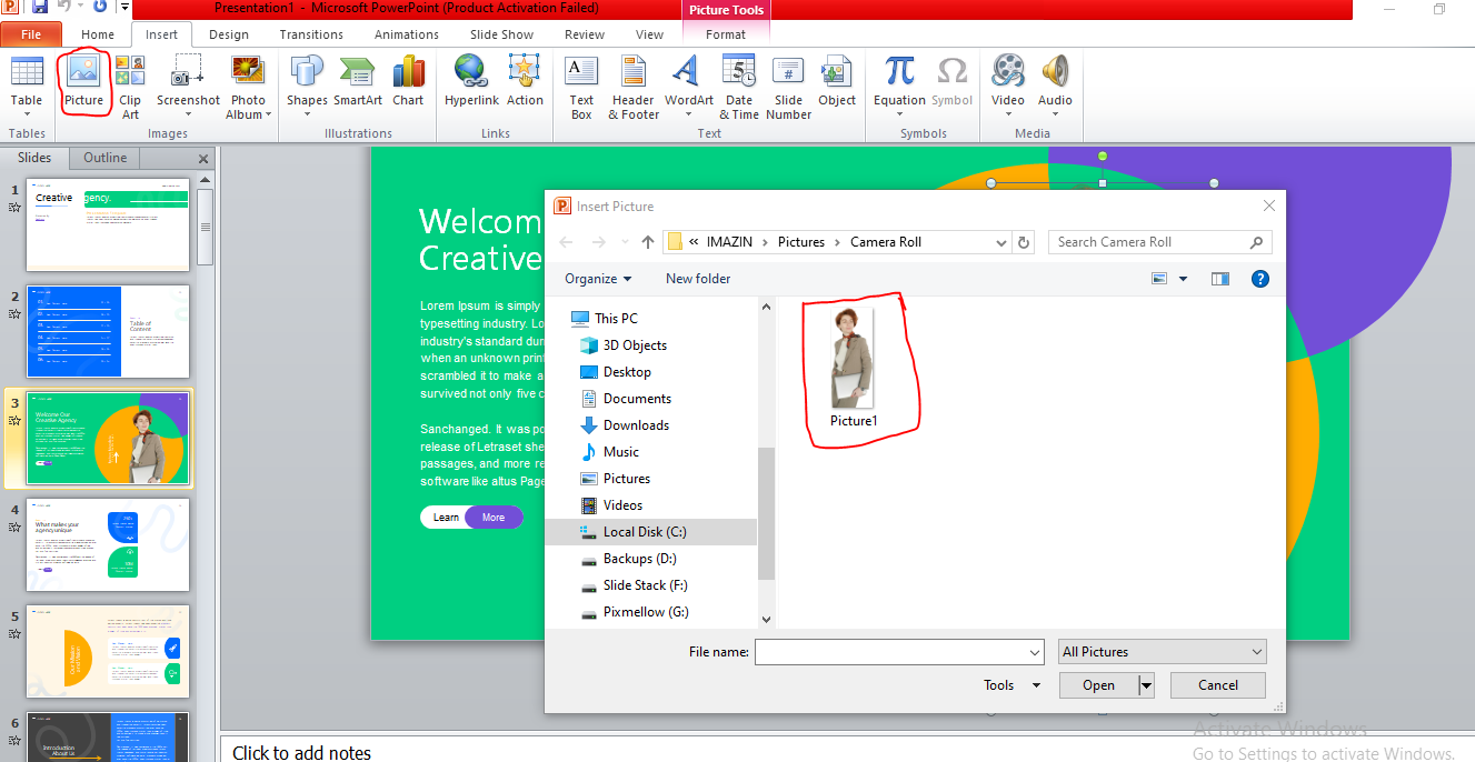 PowerPoint lets you add pictures from your computer using Insert → Pictures. You can also insert images stored in OneDrive or other cloud accounts linked to PowerPoint. This gives you easy access to photos saved online without downloading them first. For this post, we added an image to the title slide of the Creative Agency Presentation Template by replacing the sample image.