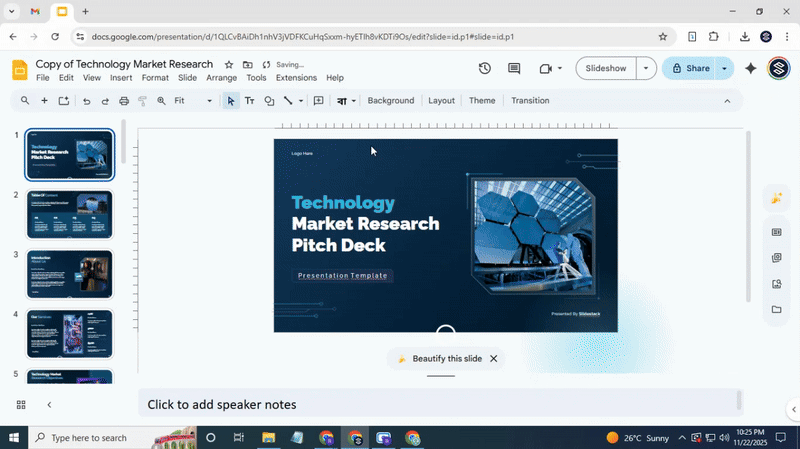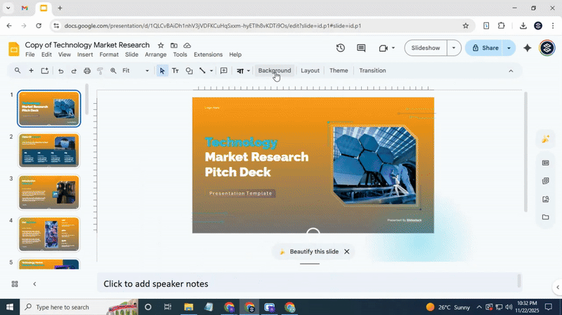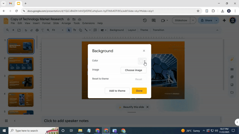 • To update every slide, click Add to theme or select Apply to all slides in the background menu. This keeps the look consistent across your presentation.