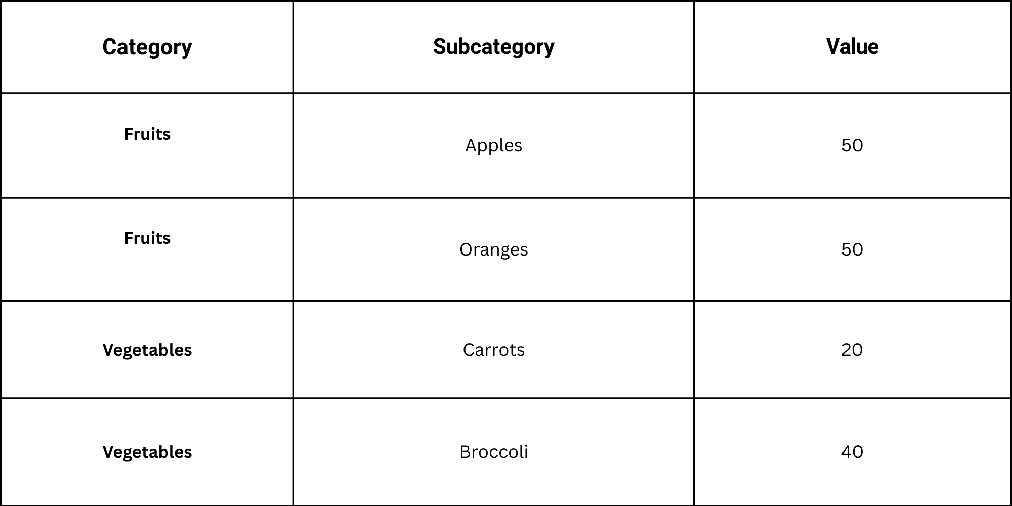 Arrange data hierarchically in a table with categories and subcategories. Include numeric values for size. Clean, structured data ensures the treemap displays correctly.